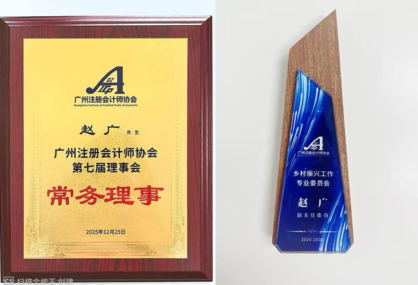 近日,广州注册会计师协会第七次会员代表大会顺利召开。我司赵广同志凭借专业实力与行业贡献,成功当选广州注册会计师协会第七届理事会常务理事,同时受聘担任广州注协乡村振兴工作专业委员会副主任委员(2026-2030 年),双职履新,获颁任职牌匾与聘书。
